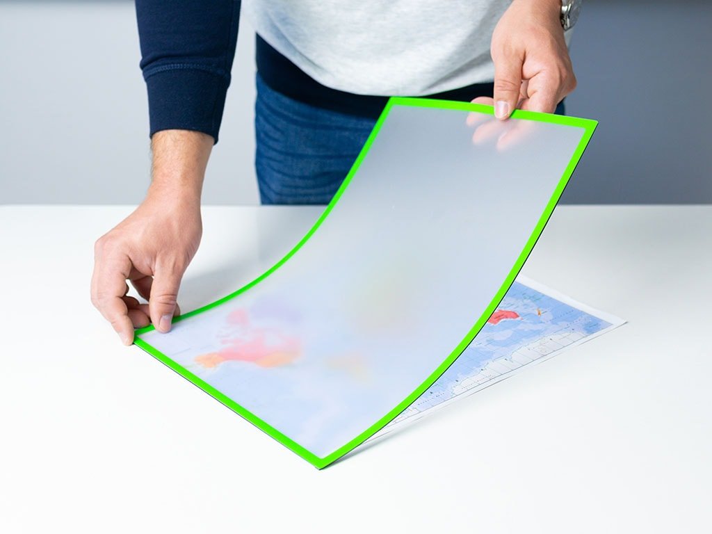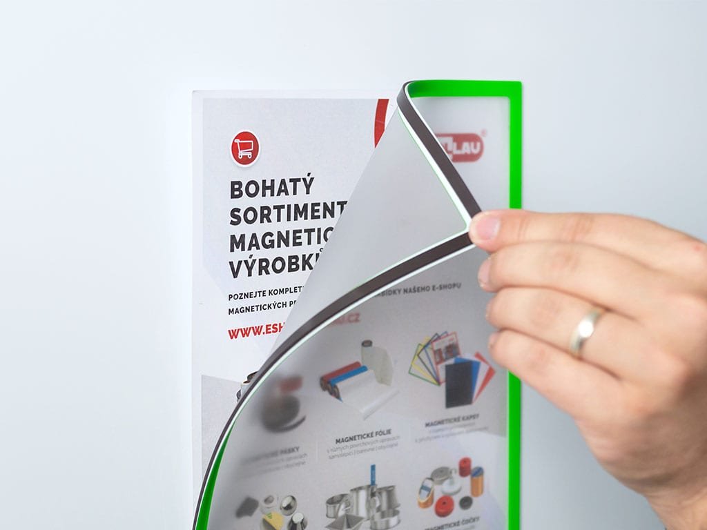 The front part of the magnetic pocket with a frame in A3 size is equipped with a dull transparent PVC foil, lined with colored magnetic tape. The solid magnetic frame created in this way allows easy insertion of the presented documents. The rear frame part is formed by a brown flexible magnetic foil in width of 6 mm through its entire perimeter. The framed magnetic pocket is suitable for the visualization of messages in combination with a "whiteboard" or another metal surface. It can be fixed in both horizontal and vertical positions.
